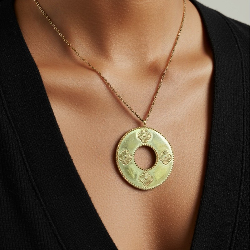 مزينة بأربعة نقوش زخرفية حول الحافة الخارجية، تُبرز القلادة تصميماً دقيقاً مستوحى من الأزهار أو أشعة الشمس. كما أن الإطار المحيط بالقلادة والمزخرف بشكل خرزي يضفي ملمساً إضافياً وعمقاً بصرياً يعزز من جاذبيتها.