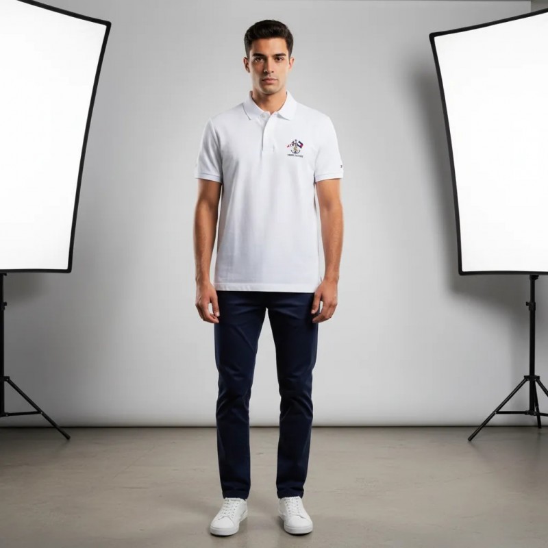 This classic white polo shirt is a wardrobe essential, combining timeless style and modern comfort. Made from high-quality cotton, it features a crisp collar and an embroidered emblem, adding a touch of sophistication to your look. Ideal for both casual outings and semi-formal events, this polo offers versatility and elegance in one piece.