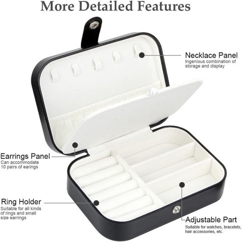 Cette boîte organisatrice de bijoux noire élégante est la solution idéale pour ranger toutes vos pièces précieuses. Avec des compartiments dédiés pour les bagues, les boucles d'oreilles et les colliers, cette boîte garantit que vos bijoux restent bien rangés. La doublure intérieure douce offre un coussin délicat pour protéger vos objets de valeur des rayures et des dommages. Compacte et stylée, elle est parfaite pour le rangement à la maison et les voyages. La fermeture à clip sécurisée garantit que vos trésors sont en sécurité, en faisant un accessoire indispensable pour tout amateur de bijoux.